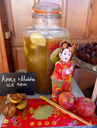 Our Oriental dessert table saw host to a Chinese chiffon cake with miso cream cheese frosting to go with an apple & matcha ice tea hydration station.